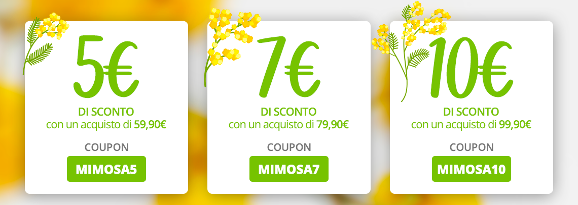 - Inserisci il codice coupon MIMOSA5 per ottenere uno sconto di 5€ su una spesa minima di 59.90€.